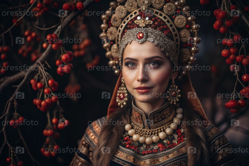 Красивая девушка в традиционном русском национальном костюме. на фоне елок. портрет символизирует традиции и красоту русского народа