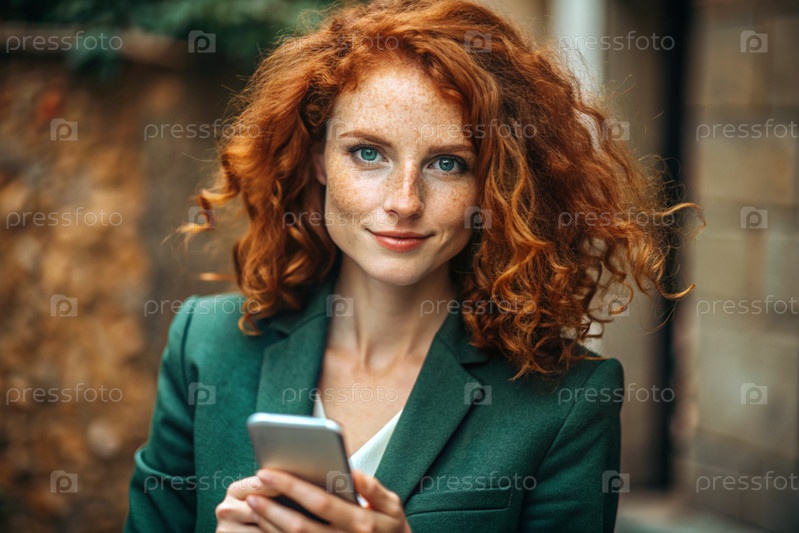 Деловая женщина с локонами красных волос и веснушками. Она одета в обычное зеленое пиджак. В руках смартфон. Небольшой бизнесмен смотрит на свой мобильный телефон