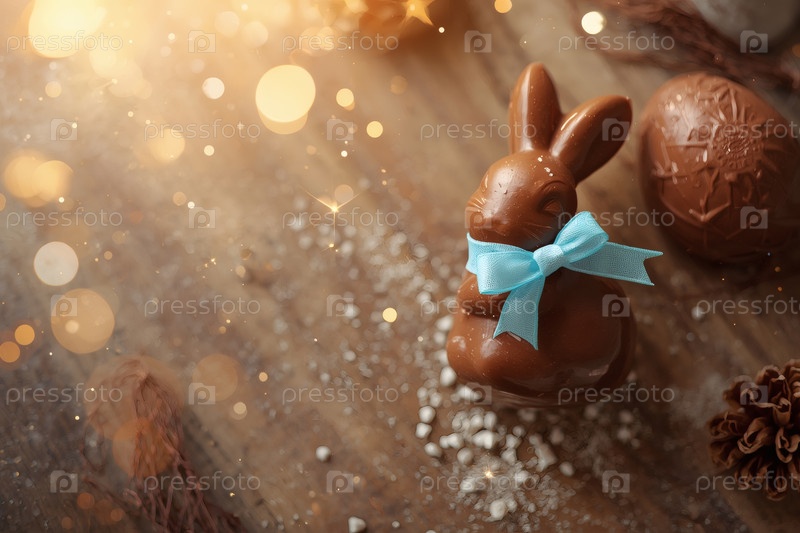 Концепция ярких пасхальных праздников в 2026 году. Красивая открытка. Баннер. Шоколадные пасхальные яйца и шоколадное зайцо на деревянном фоне. Пасхальные сладости и лакомства