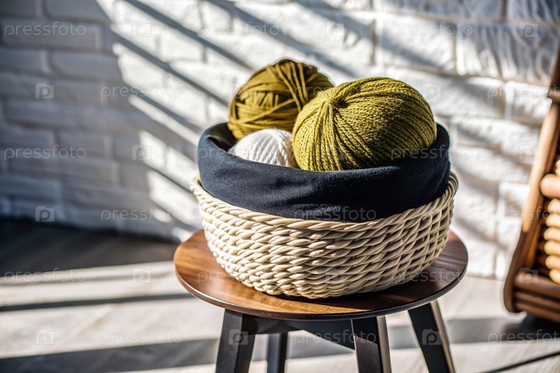 Шары из пряжи в плетеной корзине на деревянном стуле. Игла, текстиль, вязание. Зимний сезон, малый бизнес, ручная одежда