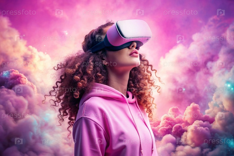 Красивая молодая девушка в розовом капюшоне играет в виртуальную реальность на сказочных розовых облаках с гарнитурой виртуальной реальности перед глазами