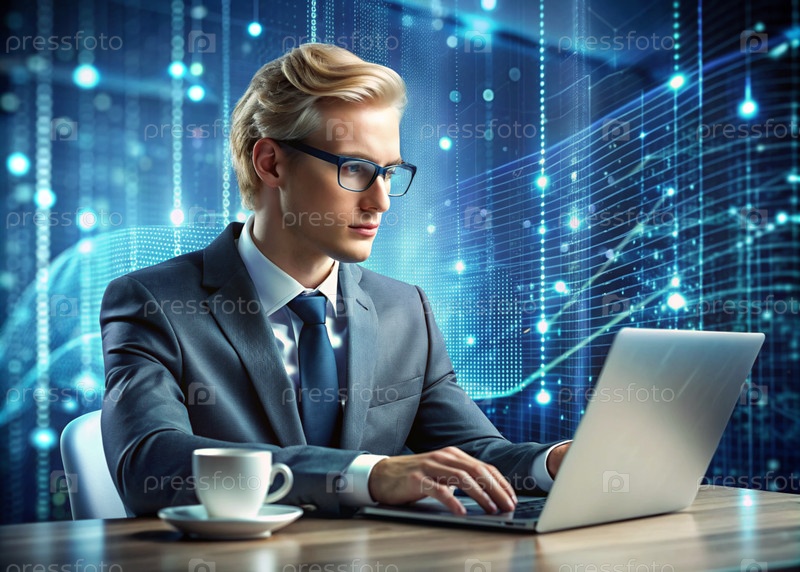 Молодой человек в костюме работает на ноутбуке в офисе с цифровыми кодами на виртуальном экране Цифровые технологии будущего Разработка программного обеспечения