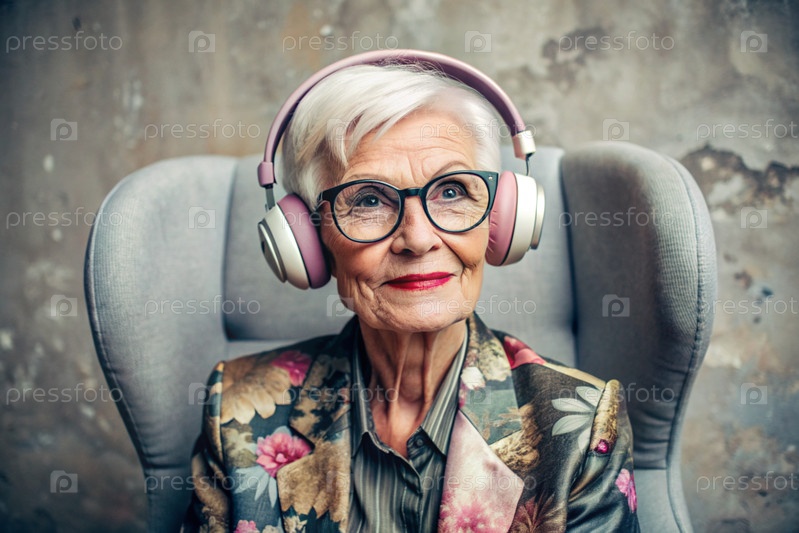 Стильная, современная, счастливая 60-70-летняя женщина слушает музыку в больших беспроводных наушниках дома, на стуле в гостиной