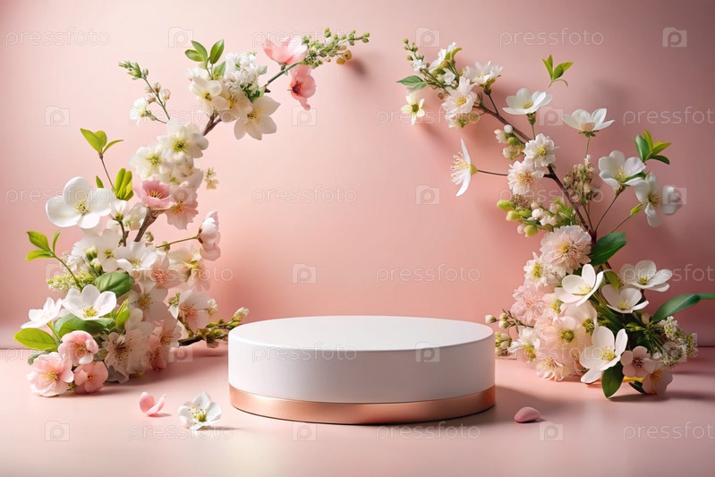 Минималистский розовый пастельный фон для демонстрации продукта.Современная подиум с розовой стеной и цветами вокруг.Креативный дизайн презентации продукции