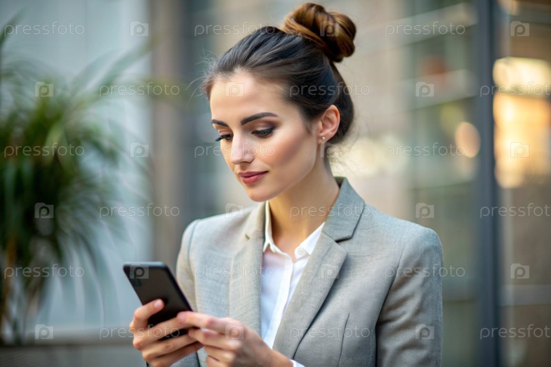 брюнетка бизнес-леди с булочкой на голове. она одета в простую куртку. в руках смартфон. бизнесмен смотрит на свой мобильный телефон