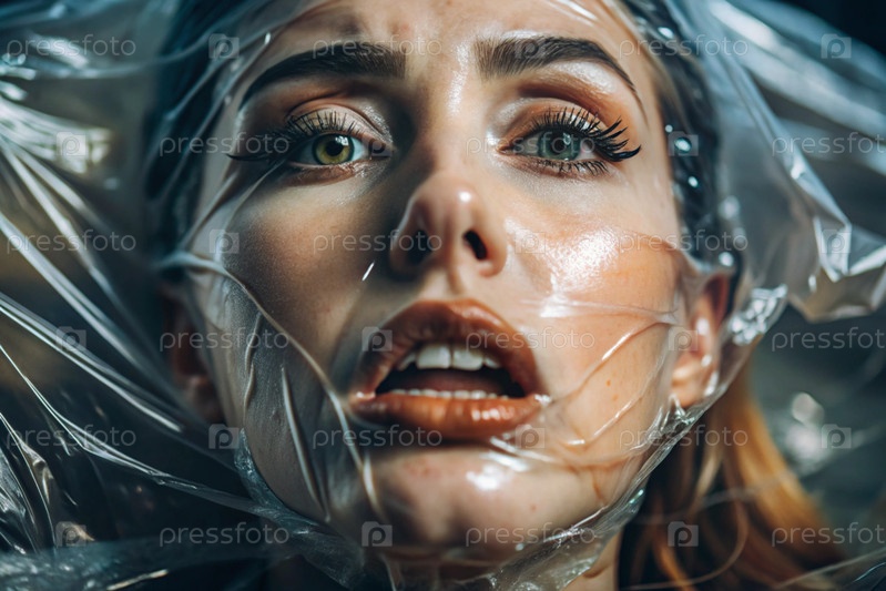 Девочка завернута в целлофан или сумку. Девушка задыхается. Пластиковое загрязнение планеты. Опасность для окружающей среды. Сокращение повторного использования пластика. Переработка. Концепция мусора