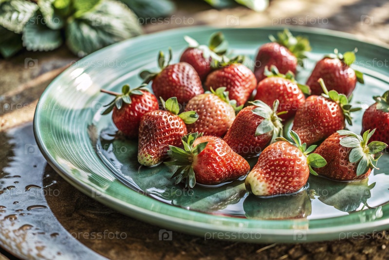 Закрытие свежих клубники. Вкусные ягоды и фрукты ярко-красные с капельками воды. Вегетарианство. Здоровое питание. Свежие плоды на столе