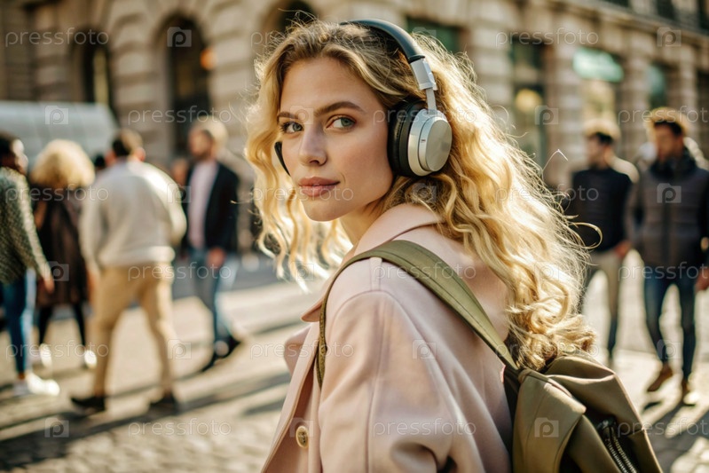 Музыкальный любитель. молодая красивая кудрявая женщина с рюкзаком на фоне улицы и людей. Турист слушает музыку в наушниках и гуляет по городу