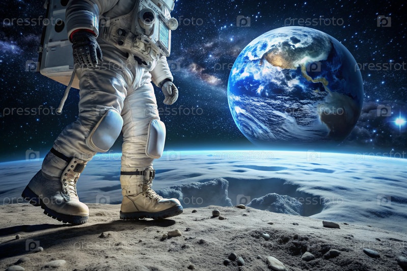 Счастливый День космоса.Астронавты в скафандре на Луне в космическом пространстве.Впечатляющий вид на планету Земля