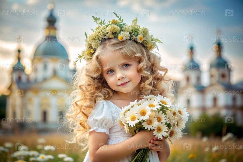 Всероссийский День семьи, любви и верности Красивая маленькая кудрявая девочка с букетом ромашек на фоне Православной церкви День святого Валентина Петра и Февронии