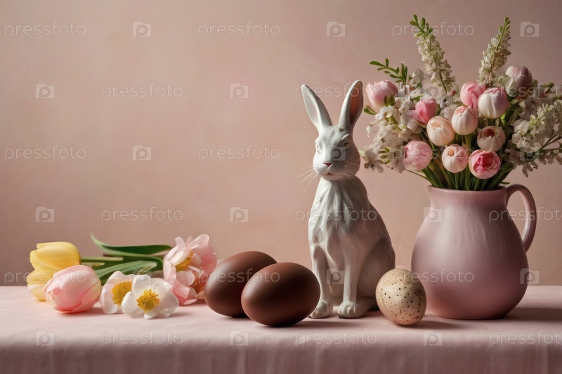 Пасхальные сладости и лакомства. Концепция ярких пасхальных праздников в 2026 году. Хорошая открытка. Баннер. Шоколадные пасхальные яйца, шоколадный кролик и весенние цветы на деревянном фоне