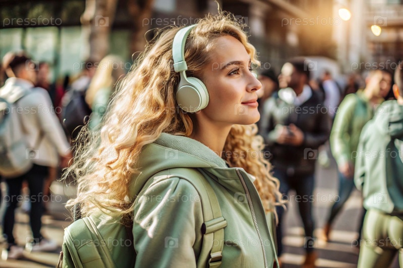 Музыкальный любитель. молодая красивая кудрявая женщина с рюкзаком на фоне улицы и людей. Турист слушает музыку в наушниках и гуляет по городу