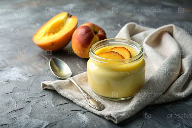 Домашний персиковый йогурт со свежими персиками, винтажной ложкой и полотенцем на стильном сером фоне