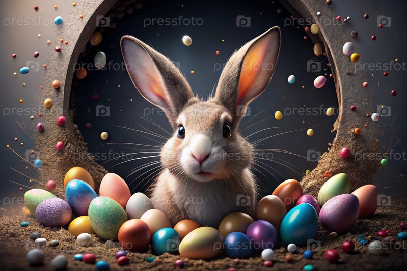 Известный праздник. милый пасхальный кролик заглядывает из ямы с красочными яйцами вокруг. концепция счастливой Пасхи