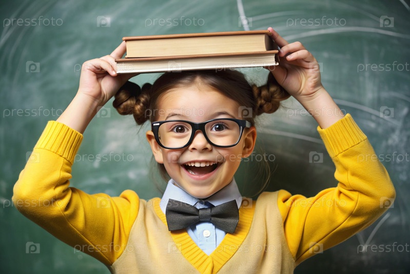 Красивая девушка с очками и книгами на голове. Ребенок впервые идет в школу. Ребёнок в классе со доской на заднем плане. Возвращение к школе
