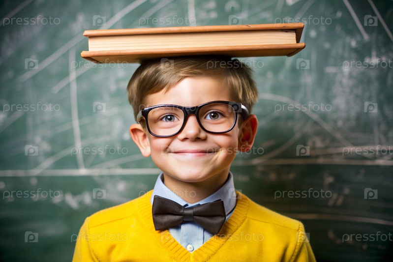 Милый мальчик с очками и книгами на голове. Ребенок впервые идет в школу. Ребёнок в классе с доской на заднем плане. Возвращение к школе