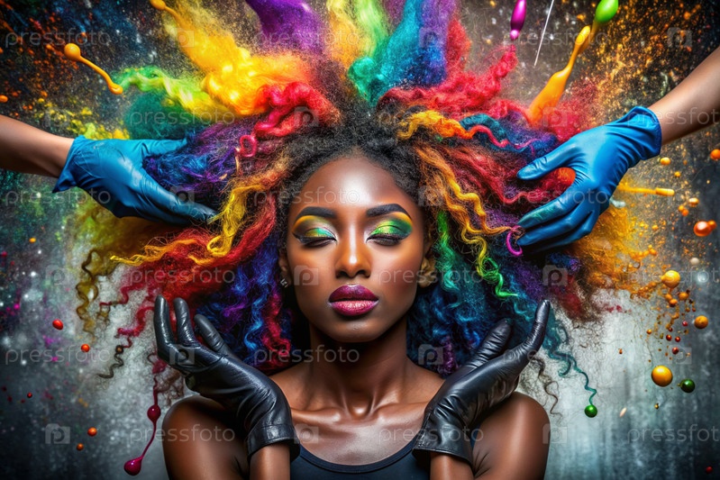 Творческий баннер для салона красоты или парикмахера. Модное профессиональное окрашивание волос. Красивая чернокожая афроамериканка с длинными многоцветными волосами. Взрыв цветов на голове