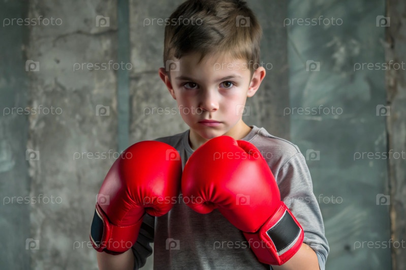 Мальчик в боксерских перчатках бьет, красивый подросток стоит в позе бойца, готового к бою