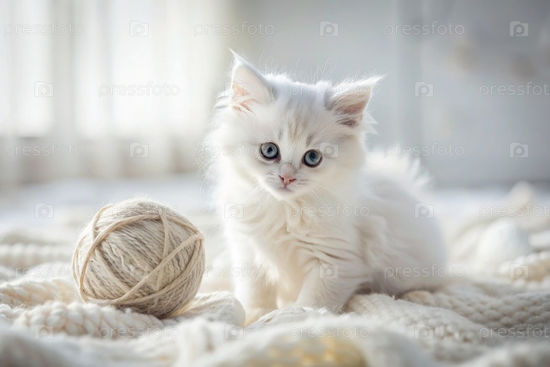 Животные. маленький пушистый белый котенок играет с шариком пряжи на белой кровати. любопытный кот лежит на белом одеяле и смотрит в камеру. текстиль, вязание