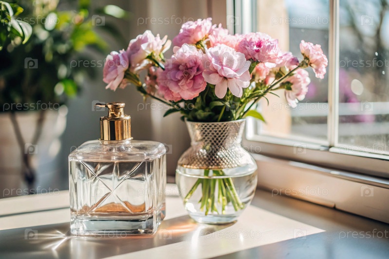 Минимальный фон для демонстрации продукта. Современная бутылка с парфюмом и букет цветов. Элегантный дизайн для презентации косметики и духов