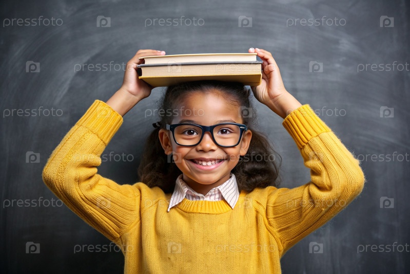 Красивая девушка с очками и книгами на голове. Ребенок впервые идет в школу. Ребёнок в классе со доской на заднем плане. Возвращение к школе