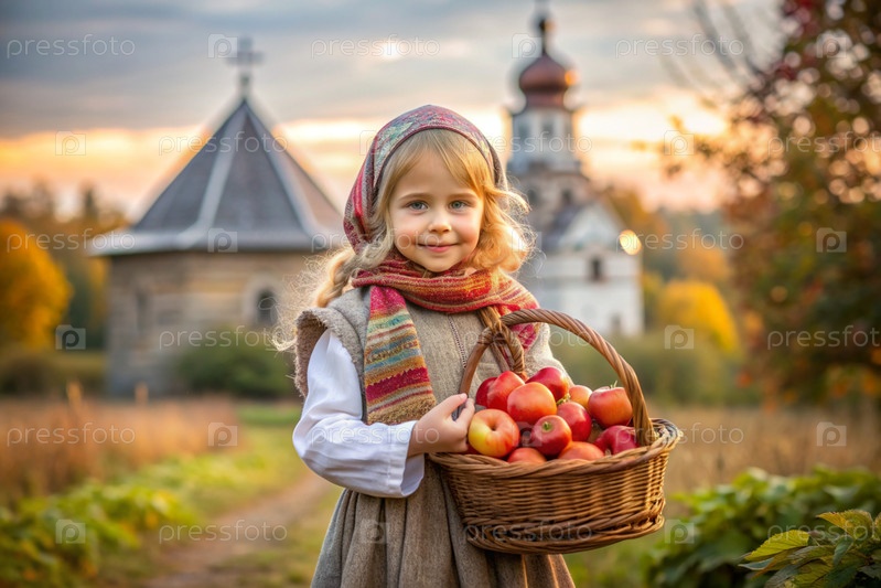 Концепция русского православного праздника Apple resort. Красивая девочка в российской национальной одежде и шарф с корзиной спелых красных яблок на фоне Православной церкви