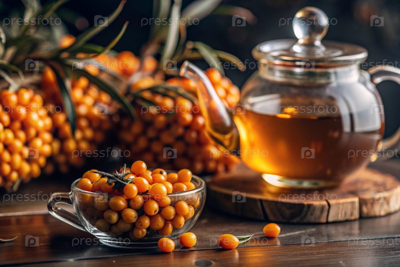 Здоровая, спелая ягода морского гречневого терна в ближайшем плане.Витамин, оранжевый, осенний, сезонный чай из ягод морского гречневого терна на темном фоне.Яблочный чай для иммунной системы