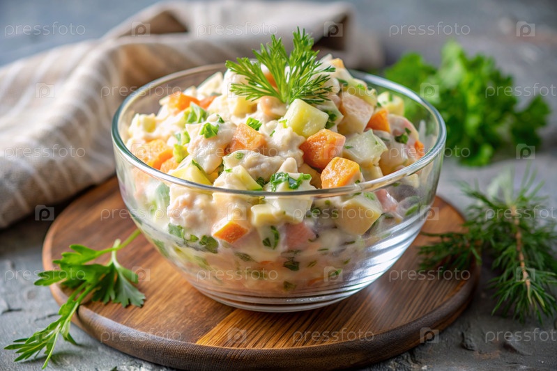 Традиционный русский салат Оливье для празднования на тарелке на деревянной столешнице. генератив AI