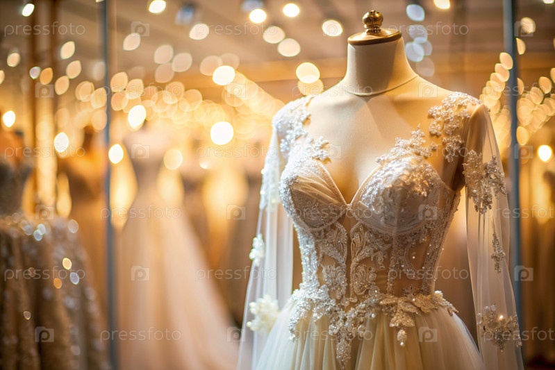 Аренда и покупка свадебных платьев для мероприятий. Близкие. Элегантное белое свадебное платье на манеке в роскошном брачном салоне