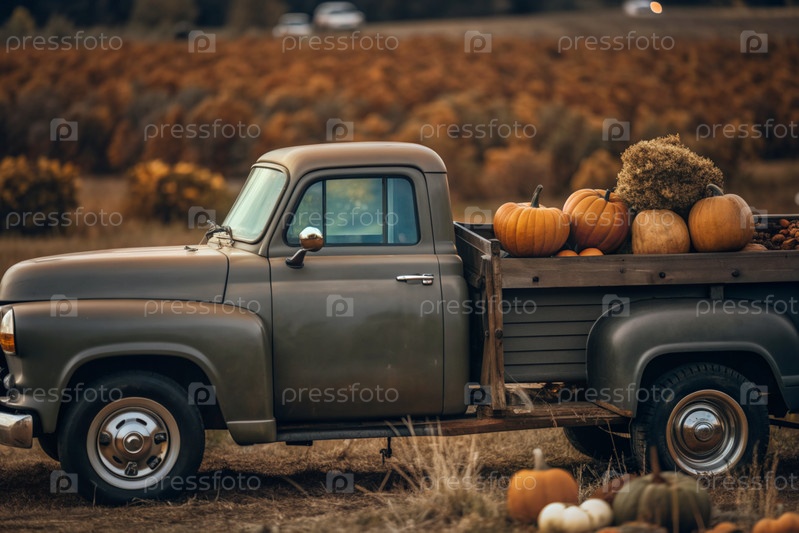 Осень, осенний дизайн.Большой урожай тыквы на заднем сиденье ретро-пикапа, крупный план