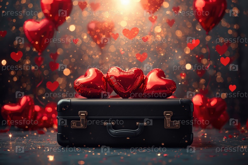 Балонный чемодан в форме сердца в гостиничном номере, чтобы отпраздновать День святого Валентина.Романтический праздник для двух любовников, действие 14 февраля