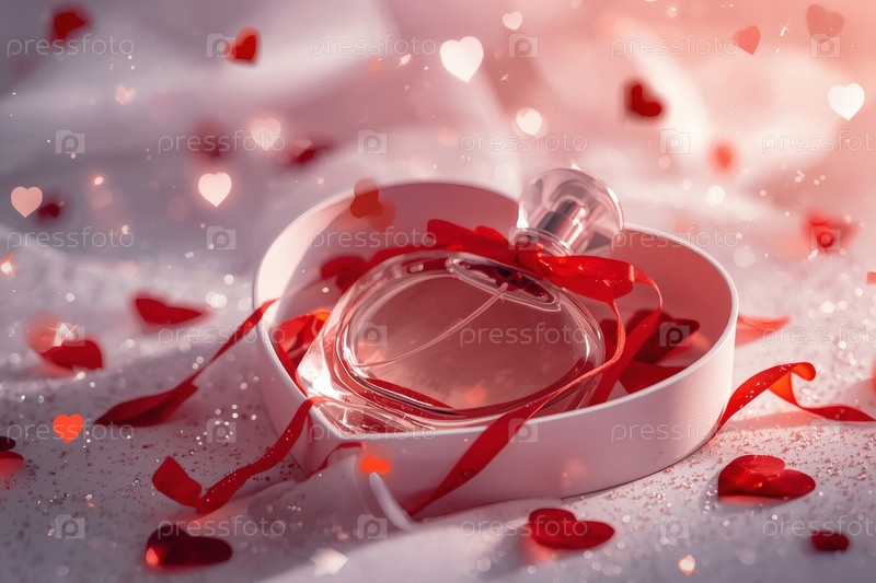 Элегантная бутылка женского парфюма в мягкой розовой подарочной коробке, украшенной красной лентой и сердцами