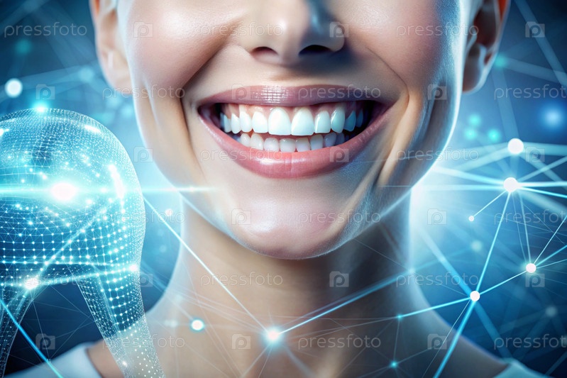 Новые технологии в протезировании зубов. Имплантаты. Улыбающаяся женщина со здоровой, идеальной улыбкой. Концепция стоматологического здоровья и ухода за зубами
