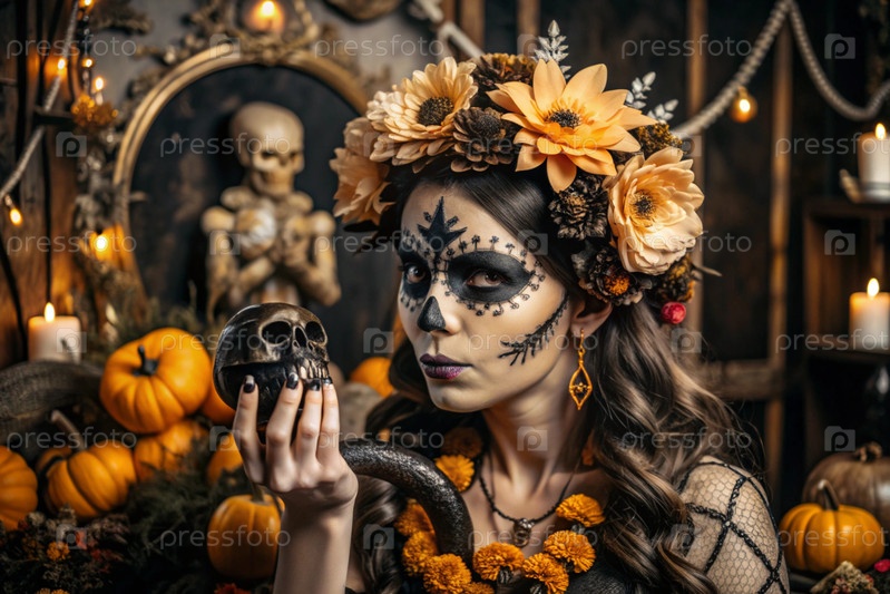 Концепция Хэллоуина. Ужасно. Костюмированная вечеринка. Красивая женщина с покрашенным черепом на лице и цветами на голове. Баннер, открытка