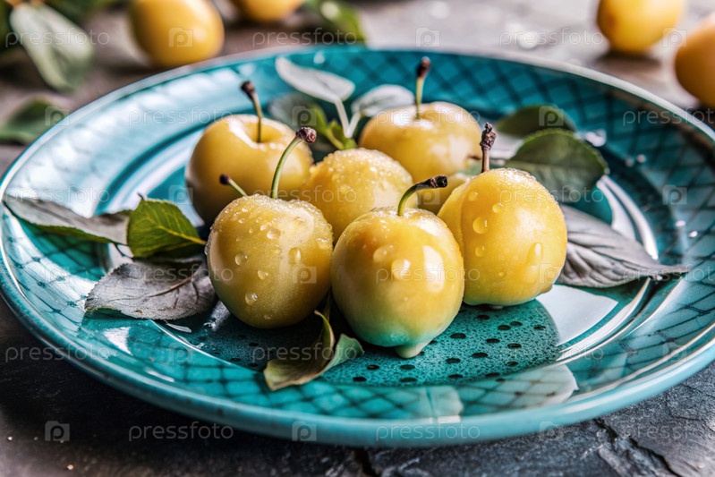 Закрытие свежих слив. Вкусные ягоды и фрукты ярко-желтого и фиолетового цвета с капельками воды. Вегетарианство. Здоровое питание. Свежие плоды на столе