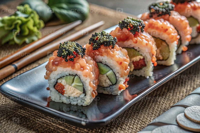 Японская еда. Суши-роллы Калифорния, Филадельфия с угорьем, красной икры и лососем. Концепция меню суши-бара