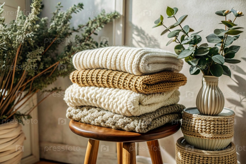 Близко, вяжу тёплую одежду на деревянном стуле в комнате.Зимний сезон, малый бизнес, ручная одежда