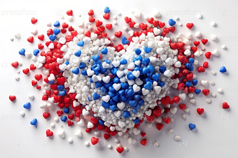 Концепция праздника День России 12 июня. Взрыв цветов в форме сердца, триколор России. Белый, синий, красный. Любовь к Родине