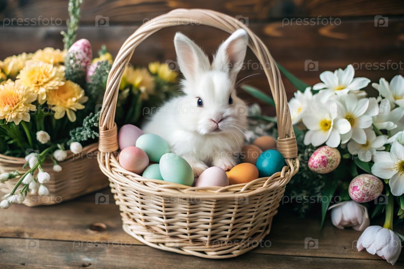Баннер. пасхальный кролик в плетеновой корзине, наполненной красочными пасхальными яйцами. концепция весенних праздников Пасхи