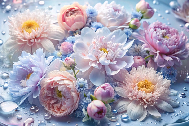 Красивый, воздушный, деликатный цветочный фон в синих и розовых тонах. цветы пиона, хризантемы, ромашки с каплями воды на лепестках