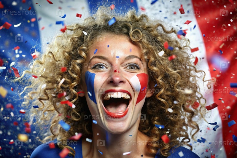 Красивая спортсменка или чирлидер из Франции с радостными криками после победы на Олимпийских играх на фоне французского флага
