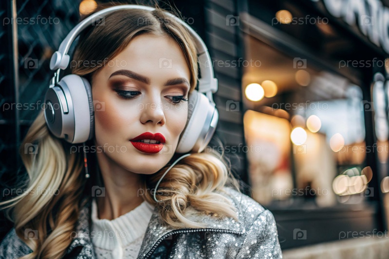 Молодая красивая гламурная девушка с большими наушниками и ярко-красной помадой, слушающая музыку на ушах