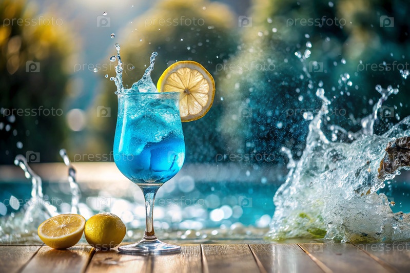 Стакан вкусного голубого коктейля 'Голубая лагуна' на фоне бассейна. алкогольный коктейль сочный фруктовый синий с ликером Curacao, кубиками льда и ломтиком лимона
