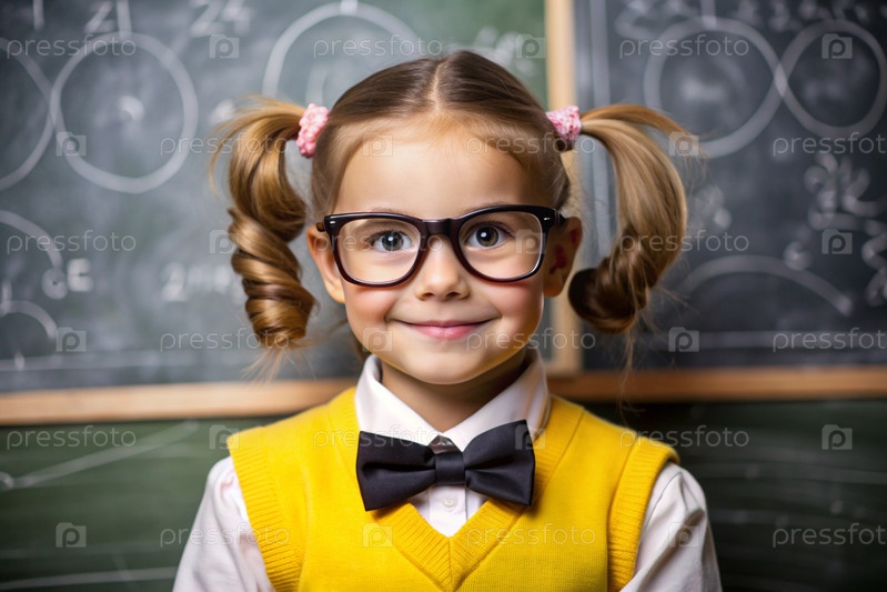 Красивая девушка с очками и книгами. Ребенок впервые ходит в школу. Ребёнок в классе с доской на заднем плане. Возвращение к школе