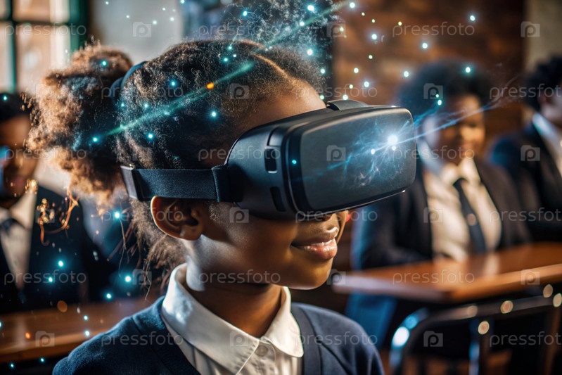 Чернокожая африканская девушка с очками виртуальной реальности.Ребенок находится в классе, а другие ученики на заднем плане.Цифровой интерфейс отображается в наушниках