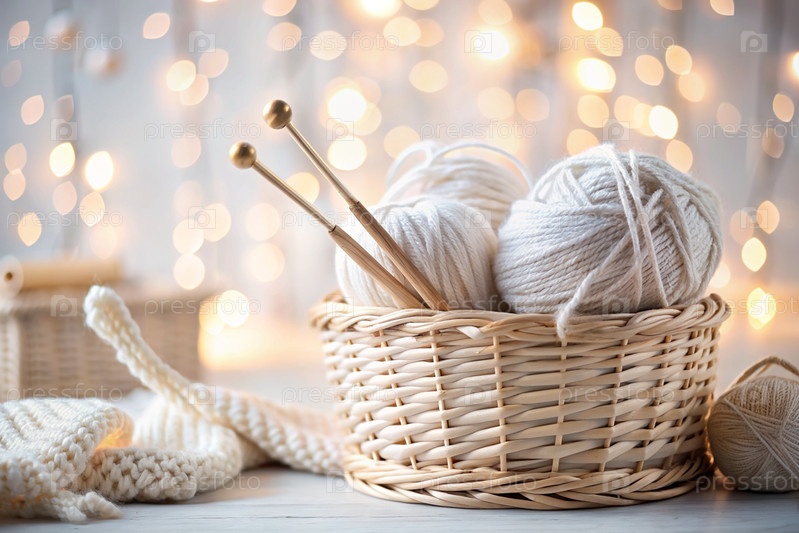 шарики пряжи в корзине из плесеня в белых и бежевых тонах швейная работа, текстиль, вязание зимний сезон, малый бизнес, ручная одежда