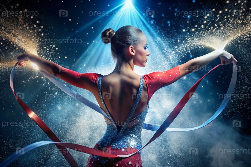 Ритмическая гимнастика - это крупный план красивой гимнастки с лентой в центре внимания на спортивной арене