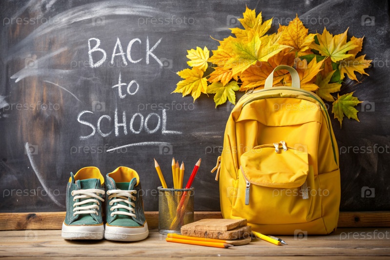 Праздник приходится на 1 сентября. Рюкзак, кроссовки и карандаши. Знак 'Возвращение в школу' на доске. Концепция нового учебного года в школе. Давайте вернемся в школу. День осенних знаний