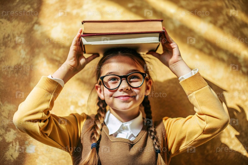 Красивая девочка с очками и книгами на голове.Ребенок впервые ходит в школу.Дети на свежем воздухе.Возвращение к школе