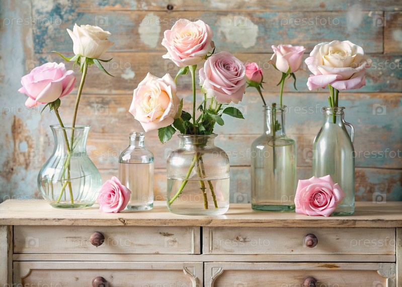 Красивые розы в стеклянных вазах и флаконах на древнем деревянном шкафчике Букет цветов в вазе в интерьере дома Светлый, бежевый, розовый цветочный фон